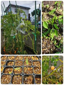 4月上旬、子どもと一緒に大玉トマトの種をプランターに蒔きました。なかなか芽がでず、やっとでてきたと思ったら全然大きくならず…もうダメかと思い諦めかけたのですが、一縷の望みを託し地植えにすることにしました。すぐに大きくはなりませんでしたが、真夏の水やりなど子どもたちやスタッフが世話をしてくれたおかげで、大きく成長しました。茎も太く、枝葉も生い茂り、支柱を立てるほどになりました。が、しかし、それからはなかなか実がならず…。実がならないのだと諦めかけたその時、小さい実を発見しました!しかも1つだけ実が赤くなっていました。1つだけ、赤い、奇跡のトマト!を見つけた時は、とても嬉しかったです。すぐに子どもに伝えると、「収穫をしたい!」と言ってくれ、収穫祭をやりました。奇跡のトマトは収穫をしてくれた子が、大事そうに持って帰りました。ということは、実がならないわけではない。どういうことか調べてみると、実がなるまでには、大玉トマトは開花後50~60日かかるとあり、逆算してみると、まだその時期ではなかったのです。それからは、ひたすら水やりに徹しその日を待ちました。すると、なかなか増えなかった実が次々となり、驚くほど沢山なったのです。子どもに伝えると、すぐに「トマトを見たい!」と見てもらうと、トマトの数の多さにビックリしていました。「赤くなったら収穫しよう!」と子どもと約束をしました。「赤くなる日が待ち遠しいな~」と思いながら、また水やりに徹しました。が、しかし、一向に赤くならず…。またかということで調べてみると、実がなってから赤くなるまでには50~60日かかるというもので、気温や日照時間によって変動し、また、「積算温度(毎日摂氏の平均温度を合計した値)」も関わっており、目安として1000℃(例えば、毎日の平均気温が20℃ならば約50日)必要となるというものでした。なんてことでしょうか。気温が低くなってきてしまっている。何か手を打たねば…。と更に調べてみると、実にビニール袋をかけることで温度を保つことが出来るとあり、早速ビニール袋をつけました。現在、積算温度が何度になっているのか、いつその温度に達するのかも不明ですが、達した時には赤くなり始めるのだと思い、日々水やりをしています。そして、その時がきたら子どもとの約束を果たしたいと思います。