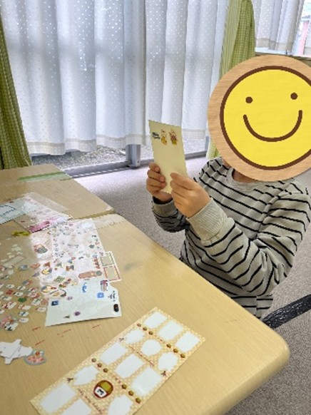 子どもたちはスタンプやシールを選び、それぞれが思い描く年賀状をゆっくりと作り始め、「先生、来年は何年?」と干支に興味を示す子や、好きなイラストを描いたり、スタンプを何度も試し押しするうちに色を混ぜて柔らかな色のグラデーションを作ったり、のびのびと製作を楽しむ様子が見られました。子どもたちが「やってみたい」という気持ちを持って取り組めるように、一人ひとりの得意なものやペースを大切に行いました。小さな成功体験の積み重ねが、自信に繋がるのではないかと思います。