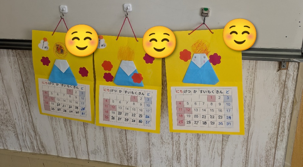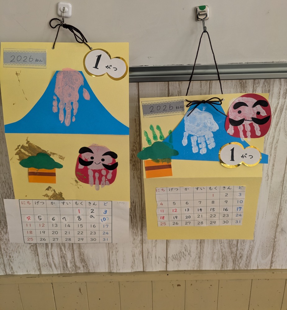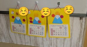 折り紙で富士山を折る、絵馬を作りそれぞれの願い事を考える、手形を取りだるまや門松を作るなど、それぞれ素敵なカレンダーを作りあげることができました。「今日はカレンダー作りだ!やったー!」と喜ぶ声や「持って帰りたい!」いう声や姿も見ることができ、カレンダー作りを通して“できた”が達成感につながっていることを改めて実感しました。
